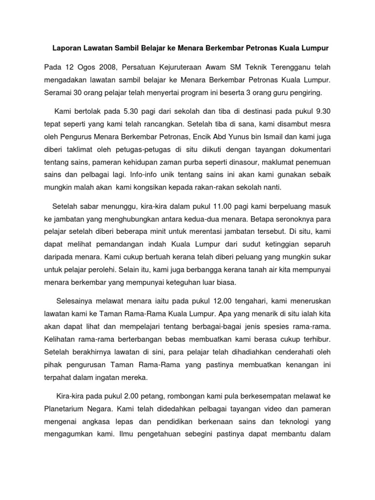 Laporan Lawatan Sambil Belajar Ke Menara Berkembar Petronas Kuala Lumpur Pdf